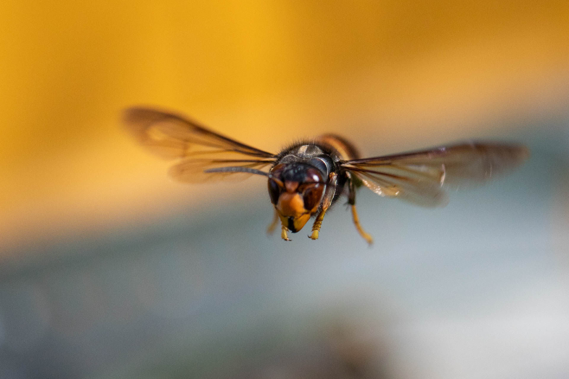 Frelon asiatique en vol. Les abeilles sont sur la défensive, elles récoltent moins de nectar et de pollen, au risque de ne pas passer l’hiver. En tant qu’apiculteur, je ne peux pas dire que j’aime cet animal, mais je l’admire ! Un formidable prédateur, rapide, agile !